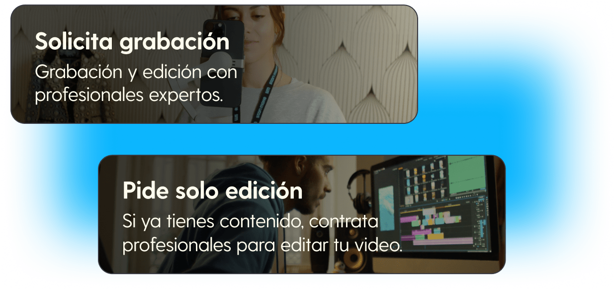Elige entre grabación y edición, o solo edición. Adapta tu servicio a tus necesidades específicas y maximiza el valor para tus proyectos personales o de marca.